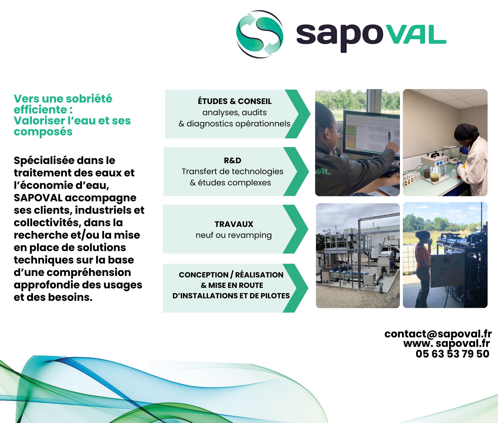 SAPOVAL, une entreprise spécialisée dans les domaines de la valorisation de l'eau et de ses composés travaillant sur plusieurs axes (auprès des entreprises & collectivités) :